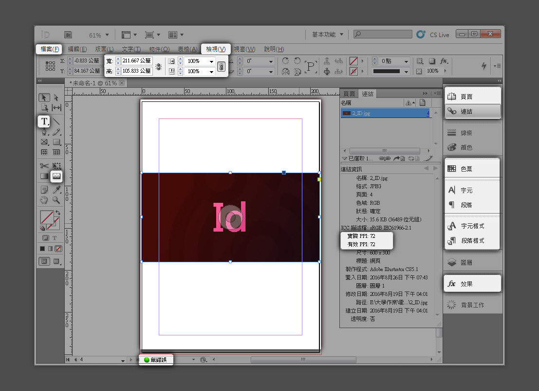 可以用來監控圖片各種資訊的面板,按右鍵可以選擇編輯檔案或開啟檔案位置。當連結的圖片更新時會亮起三角型的警示訊號。用在印刷海報的圖片有效PPI最好能到150以上才不會一看就是糢糊的。